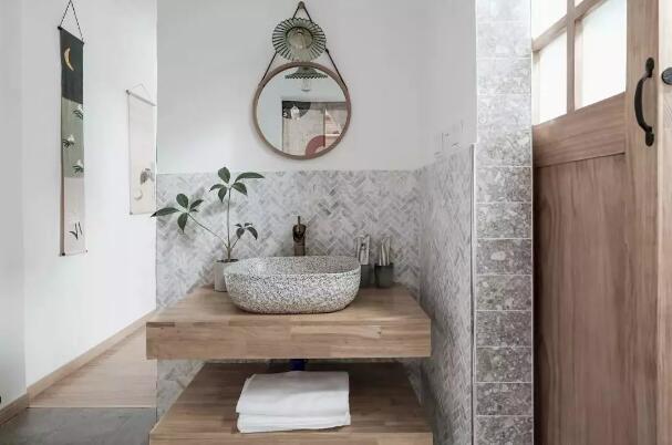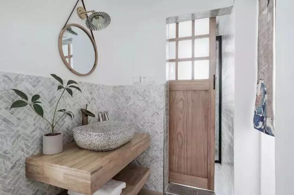 卫生间把洗手盆设置在走廊位置,整体灰色地面与墙面,双层的洗手盆架子,在台上盆的布置下,显得自然温馨而优雅。谷仓门隐藏得比较好,木质感与磨砂玻璃结合,为过道也带来采光与自然的视觉感。