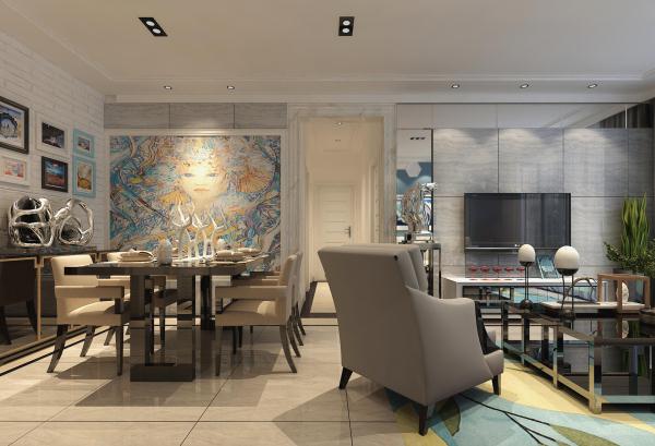 餐厅和客厅被走廊所隔开,立面极简的白色线条和大理石呼应、中间个性的壁布强化整个空间。作为视觉冲击效果最强烈的就是背景墙的壁布了,色彩分明,效果强烈。餐桌房设计师做了餐边柜,而墙面选择了白色文化砖,在配合上组合装饰画,整个就餐空间都十分富有文艺范。