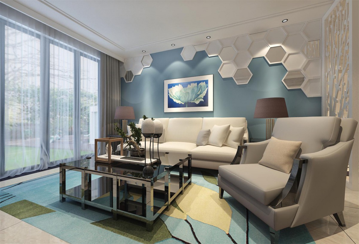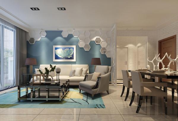 客厅整体运用白色与蓝色结合、“蜂窝”块罗列在一起恰如其分的把留白墙面美感增添色彩 展现出地中海风格的韵味。客厅部分留白给人们瞎想的空间、加上多边形的组合使整体空间变得有立体感。