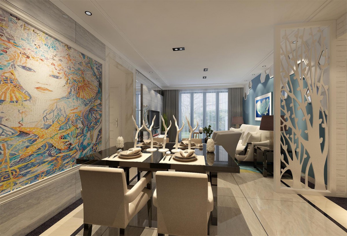客厅大面积的落地窗的采光很好的可以照射在餐厅区域内,就餐环境也温馨舒适。黑色大理石镜面搭配米色靠椅,简洁时尚。餐厅和客厅的隔断也选择了树状装饰,地中海风格的基础是明亮、大胆、色彩丰富、简单、民族性、有明显特色。重现地中海风格不需要太大的技巧,而是保持简单的意念,捕捉光线、取材大自然,大胆而自由的运用色彩、样式。