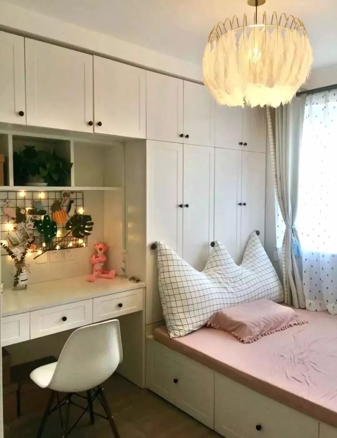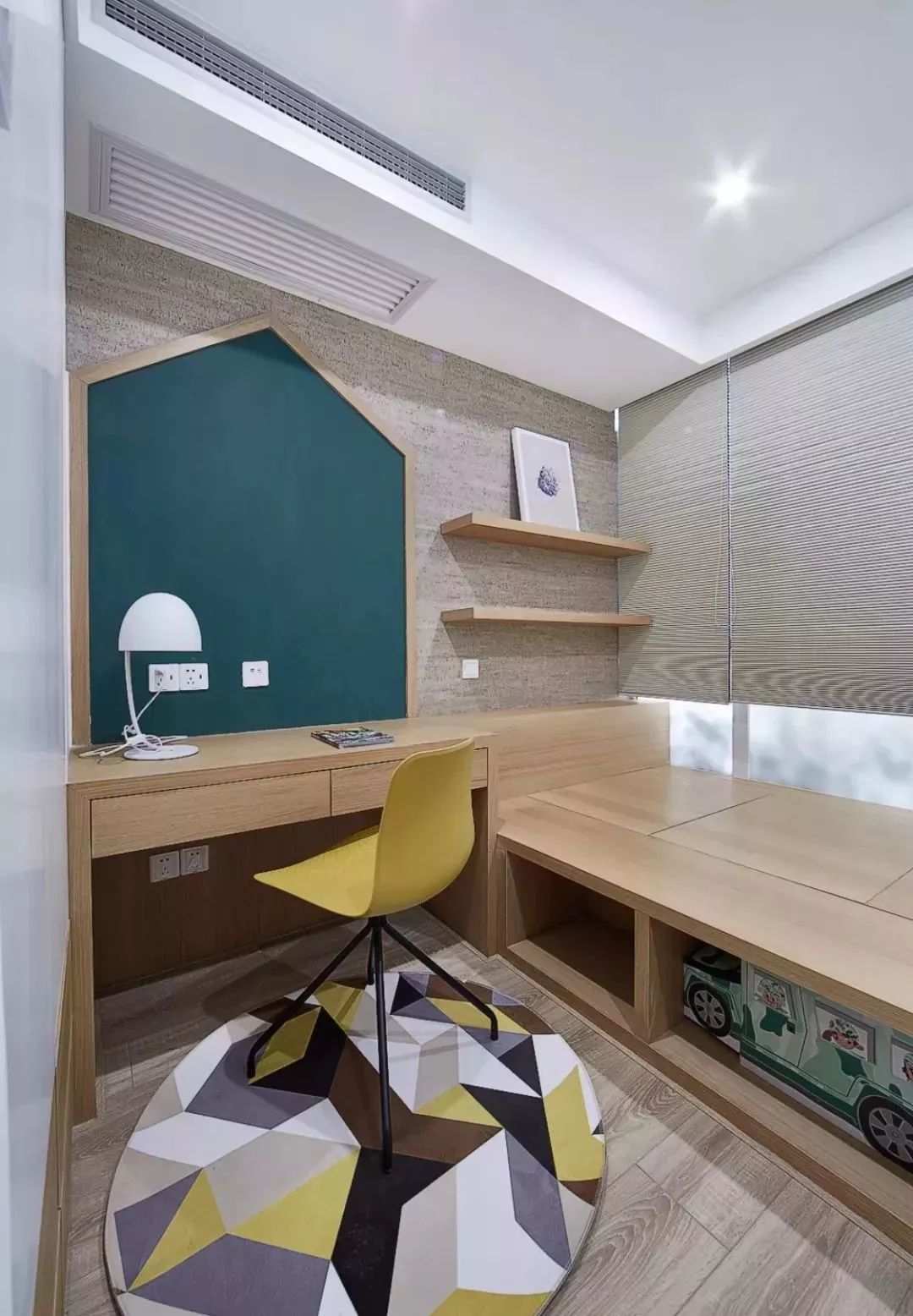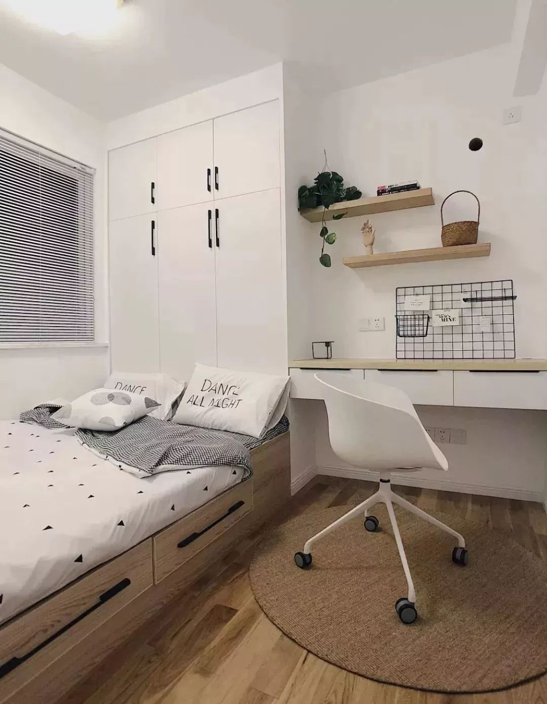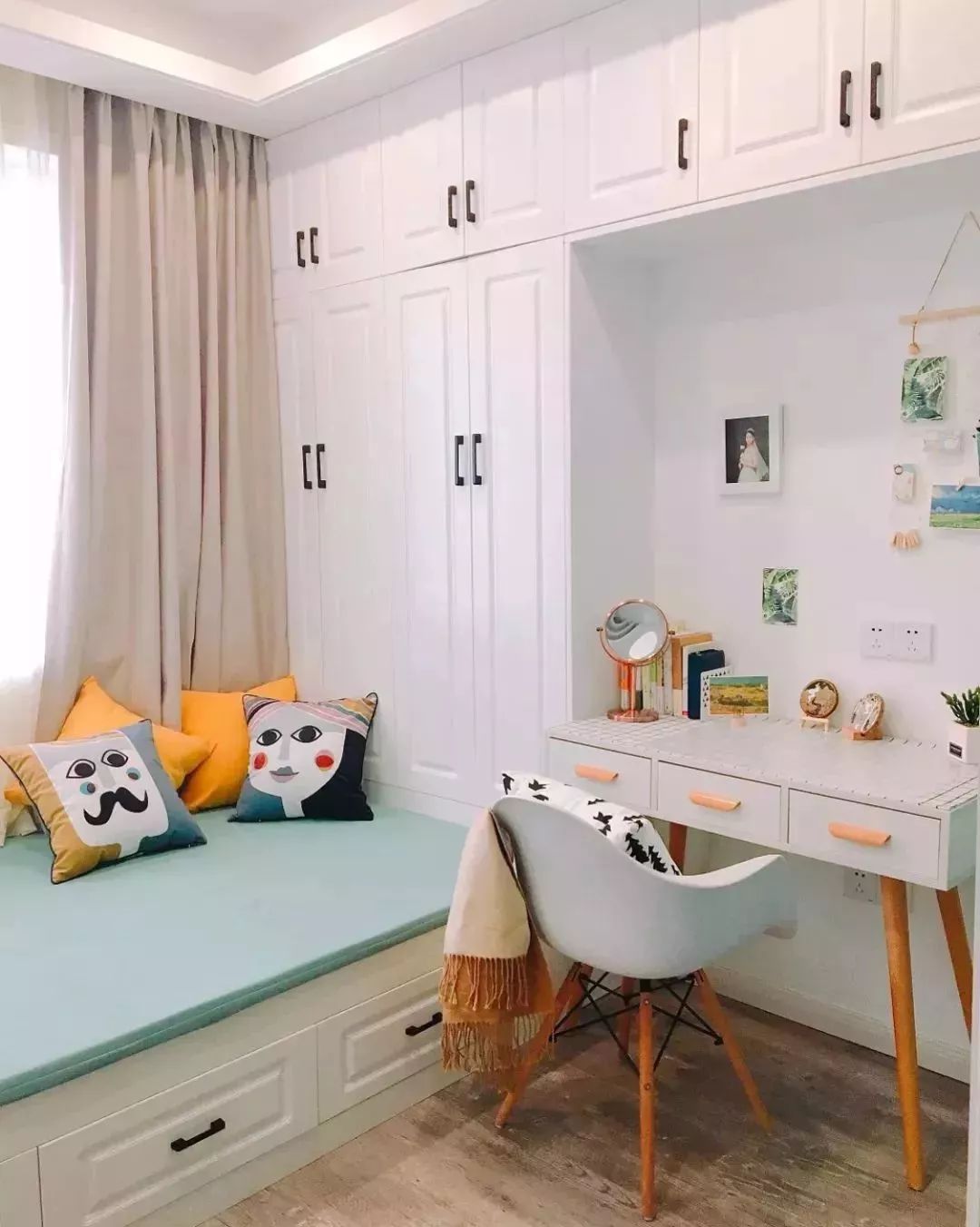 在这个书桌前方的墙面装黑板墙或则软木板,让空间更加温馨文艺。