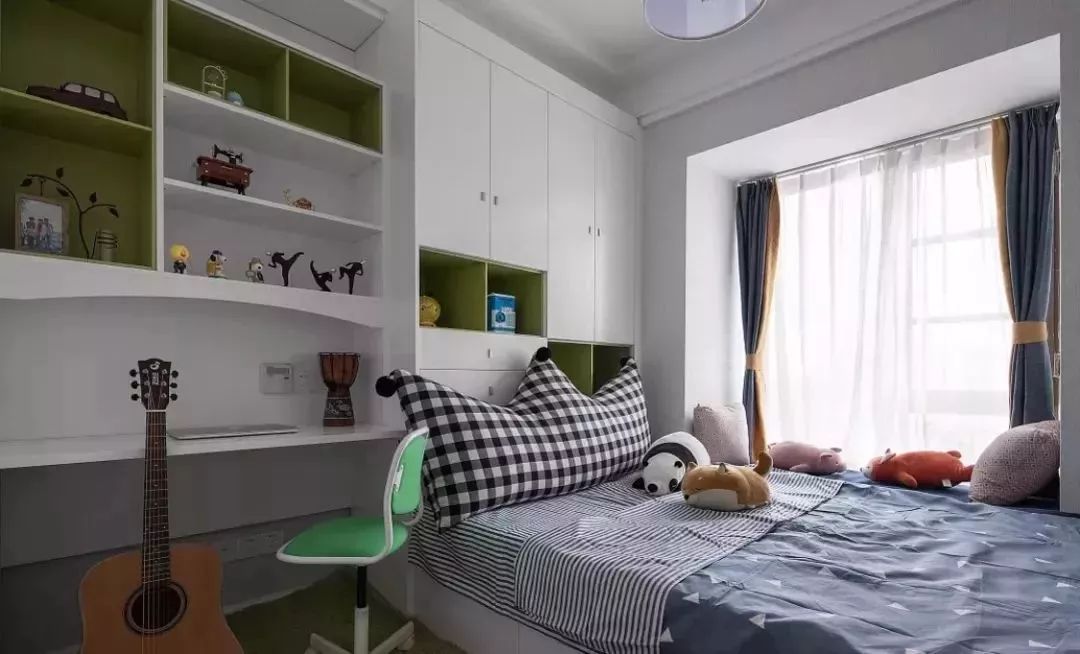 也可以在这个书桌前方的墙面装上搁板,摆上清新绿植、书籍或精致的饰品,也是很精致舒适。