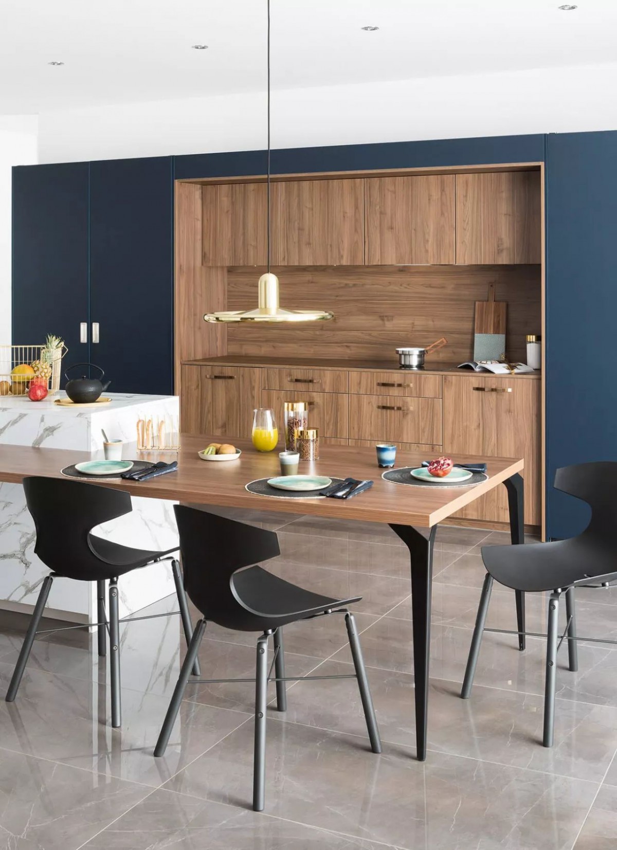 在这样的空间里,厨房在角落转弯延伸出去,形成了直角吧台。吧台平面向外延伸,得到了更加宽敞舒适的空间来用餐。这样的方案尤其适合在厨房和客厅相连接时,利用吧台作为隔断元素而不是墙,可以让两个空间和置身其中的人产生更多的交流。