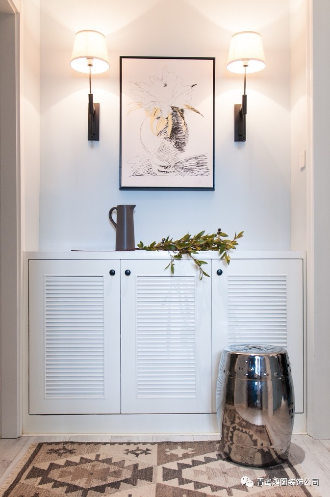 一进门便是别致的新中式格调,白色玄关柜搭配金属色中式木墩,使玄关极具现代感又不失中式韵味。