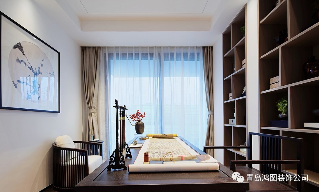 书房是与客厅一致的装饰格调,中式家具搭配山水墨画,淡泊明志,尽显一屋禅意,让整个空间变得清新静气。