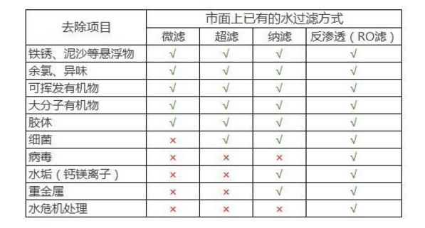 如上图所示微滤只能过滤水中的泥沙、铁锈等大颗粒杂质,超滤膜上的孔隙要比微滤小,可以过滤病菌和一部分溶解性有机物,而纳滤可以过滤溶解在水里的无机物,比如氯化钠,但并不能过滤病毒等。