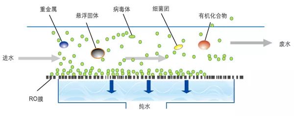 一般水的流动方式是由低浓度流向高浓度,水一旦加压之后,将由高浓度(自来水)流向低浓度(纯水)。RO膜的孔径是头发丝的一百万分之一(0.0001微米),一般肉眼无法看到。细菌、病毒是它的5000倍。因此只有水分子能够通过。其它杂质及重金属均由废水管排出。