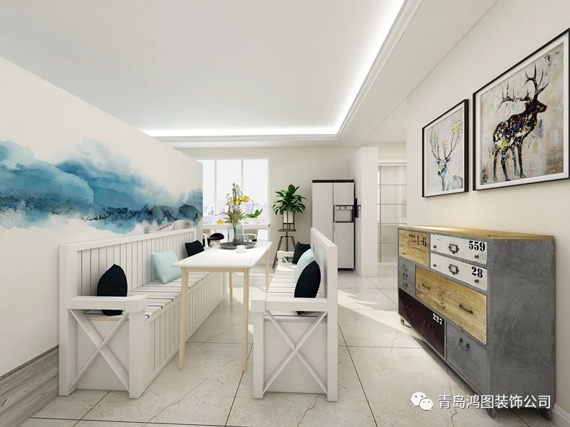 餐厅空间,用半高矮墙结合蓝色水墨画的质感作为背景墙,美得不像话,优雅卡座搭配时尚个性的餐边柜和挂画,既美观又实用,谁不会为这一方空间而沉醉?