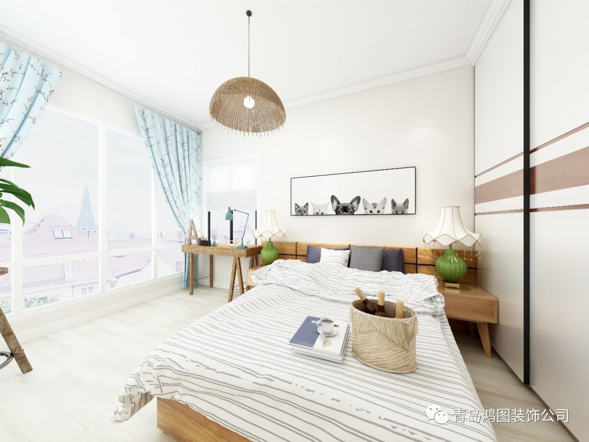 干净明亮的次卧空间,一张床,一幅画,再搭配一张桌子和一盏草编吊灯,便是一方让人安心幸福的小天地。