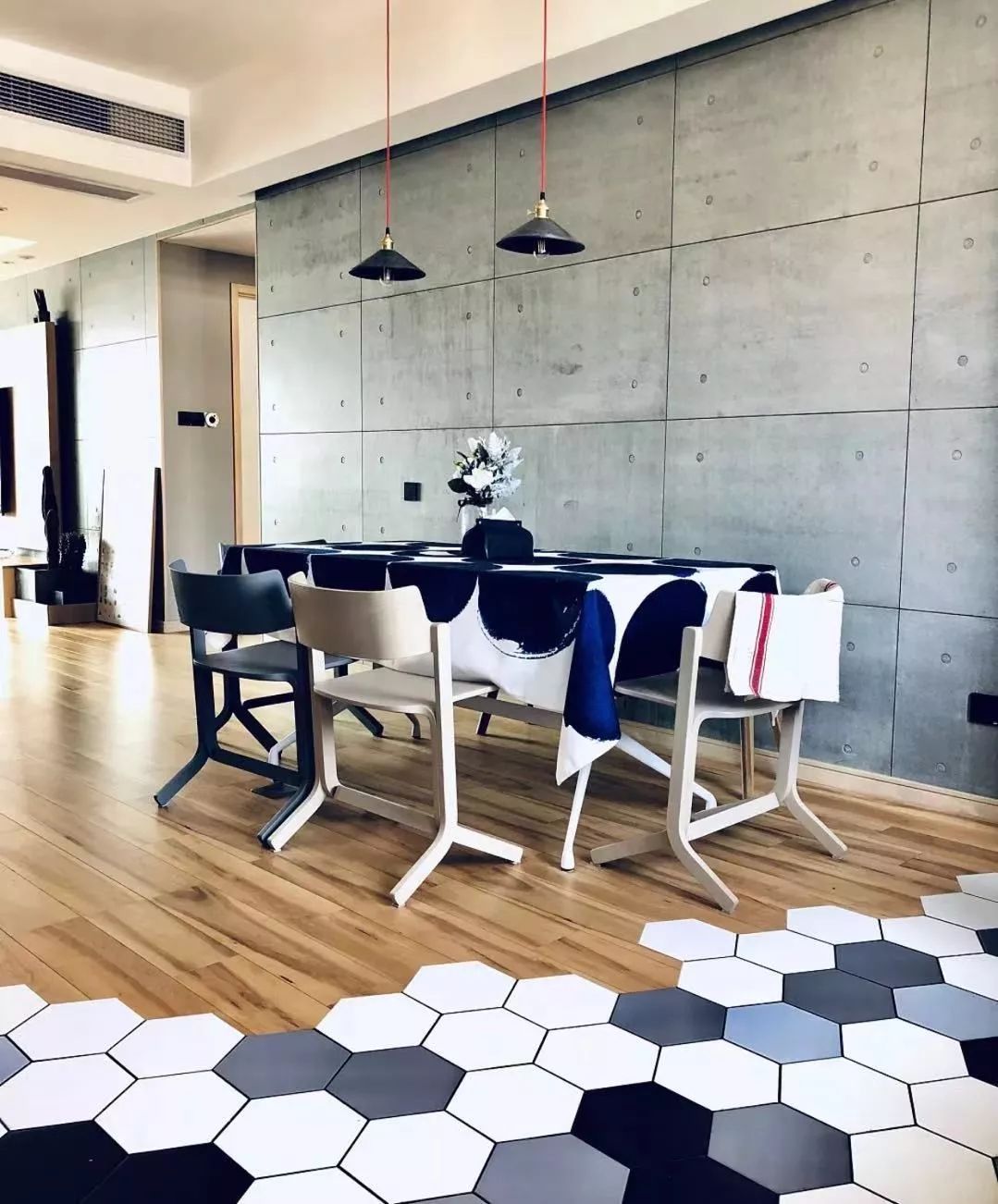 没有隔断又想区分空间,可通过地砖花纹图案或者不同的铺贴方式来划分哦!如下图所示,木地板和六角砖的拼接铺贴让空间区域划分更明显颜值高也能突出重点。