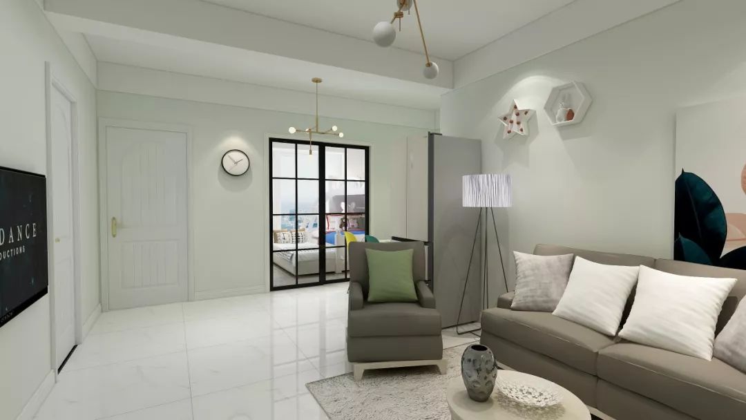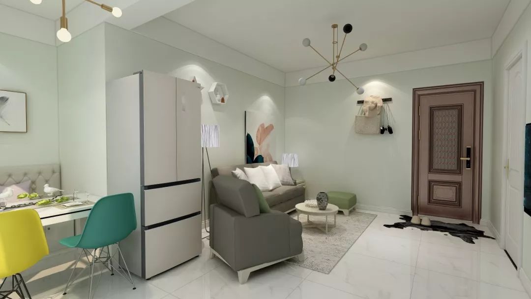 ▲主卧采用餐客厅一体的设计,淡绿色与灰色的色彩搭配提升空间质感,背景墙上的装饰画文艺清新,置物隔板可爱至极,经典的分子灯一出场便吸引了足够多的目光,个性十足。
