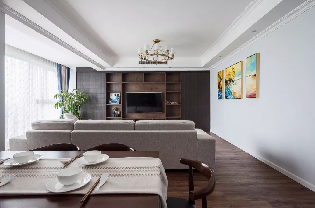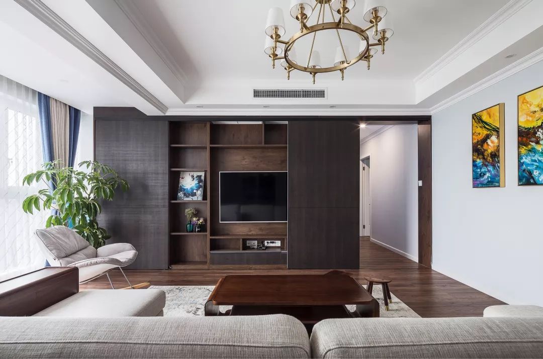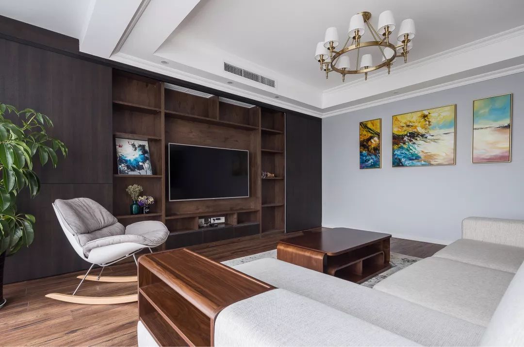 客厅的电视背景墙设计非常有趣,左右两侧相互呼应,中间是开放式的收纳柜,电视也嵌入在了柜子中,深色系的选择让客厅多出了大气感。