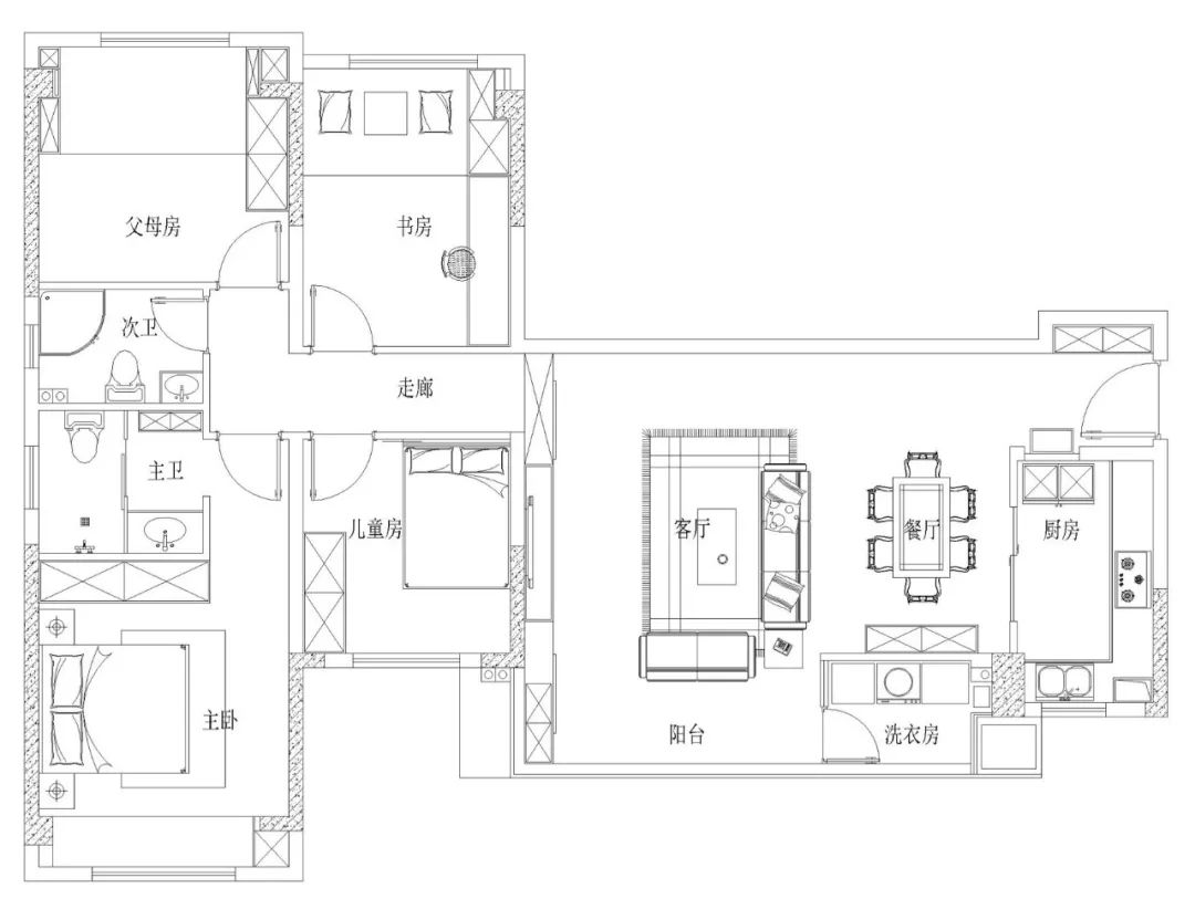 今天分享的这套137平的四居室设计得非常的有趣,设计师通过一个隐形门把户型分成了两个部分,一个大横厅的客厅、餐厅和厨房,另外一侧就是四间卧室和卫生间,这样的布局也非常符合动静区的划分。