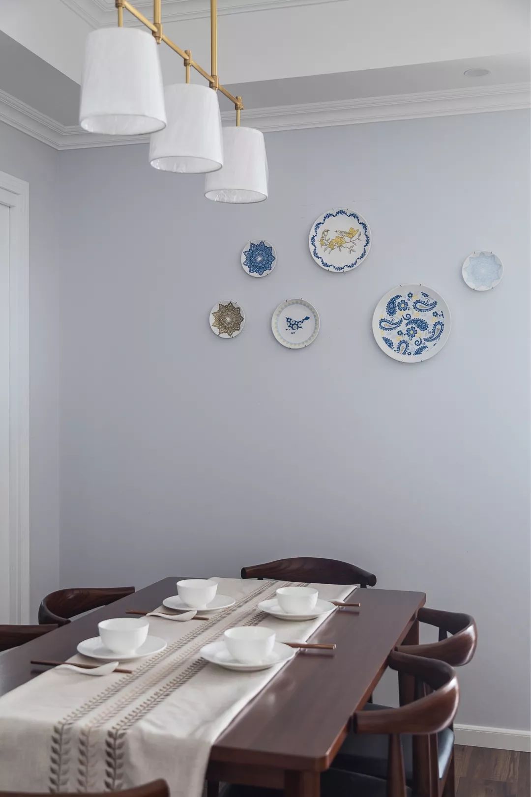 餐厅的设计非常简约,深色的实木桌椅,搭配浅色系的背景墙和瓷盘装饰,在庄重中又展现出了优雅的感觉。