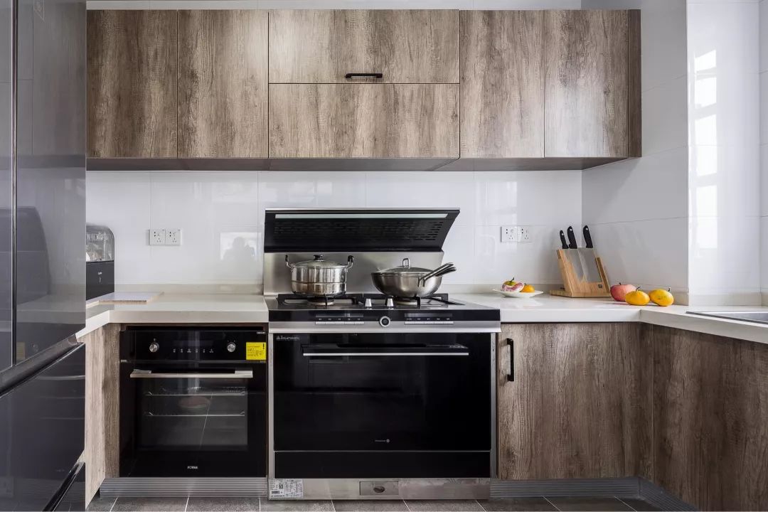 餐厅的边上是被推拉门隔开的厨房,灰木色的橱柜,搭配白色墙面砖,显得很是独特自然的气息。