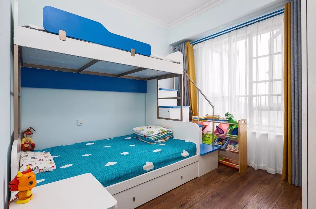 儿童房空间简单的淡蓝色墙面,搭配上一套实用的上下铺,在狭小的空间装出了一个舒适居住功能。