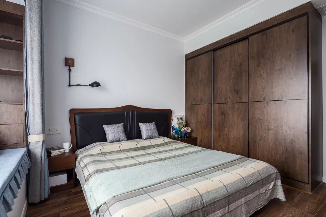 卧室的衣柜和床都是深色系的,和大气的床品也非常搭,而背景墙和飘窗、窗帘的软装又有小清新的感觉,搭配起来既庄重又时尚。