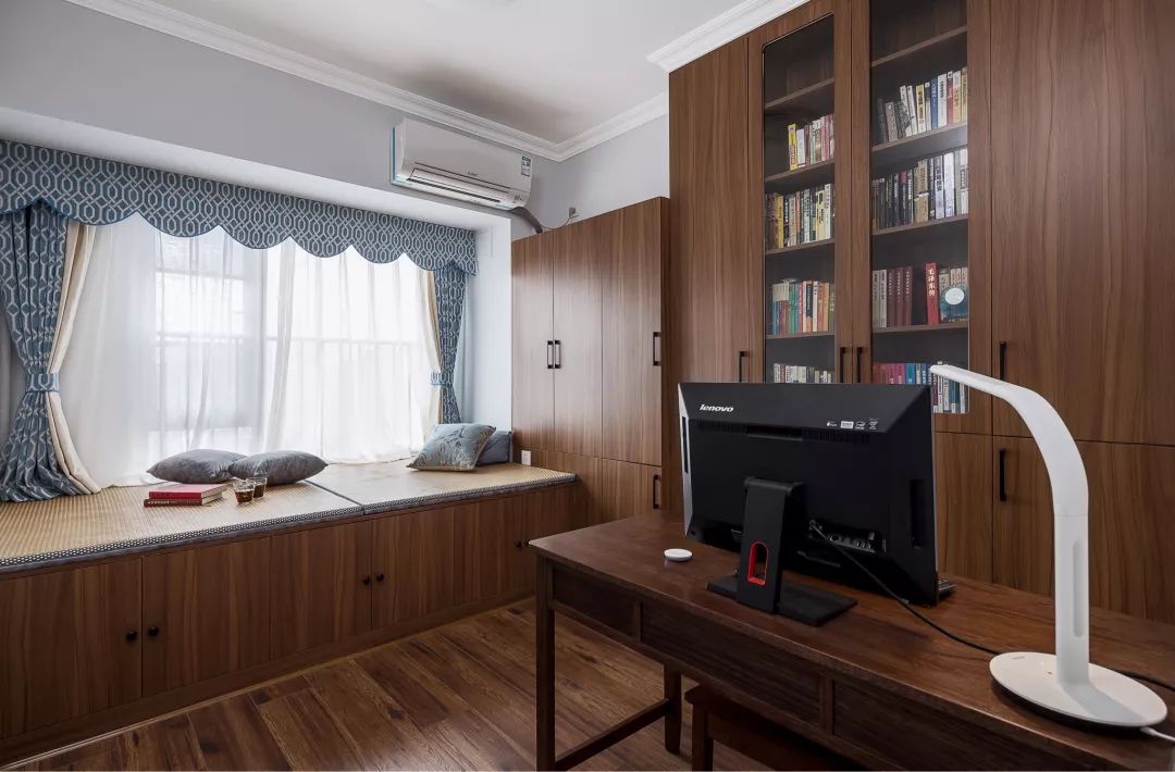 书房的空间还是比较宽敞的,在靠窗的位置做个榻榻米,就可以满足收纳,工作累了也能随时休息,到顶的大书柜让屋主再也不用担心家里东西放不下。