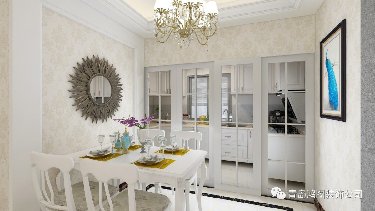 餐厅空间,第一眼便深深爱上,纯白的餐桌椅搭配欧式复古壁挂镜和孔雀挂画,让与家人用餐的时光变得温馨又浪漫。