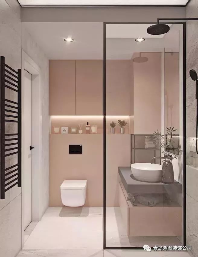 把整个卫生间的顶部做平的吊顶,这样的设计整体性比较强,是一种设计视觉效果比较强的方案。