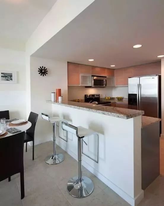 其实在餐厅中设一个吧台来代替餐桌,已是很常见,当然这也是比较实用的。
