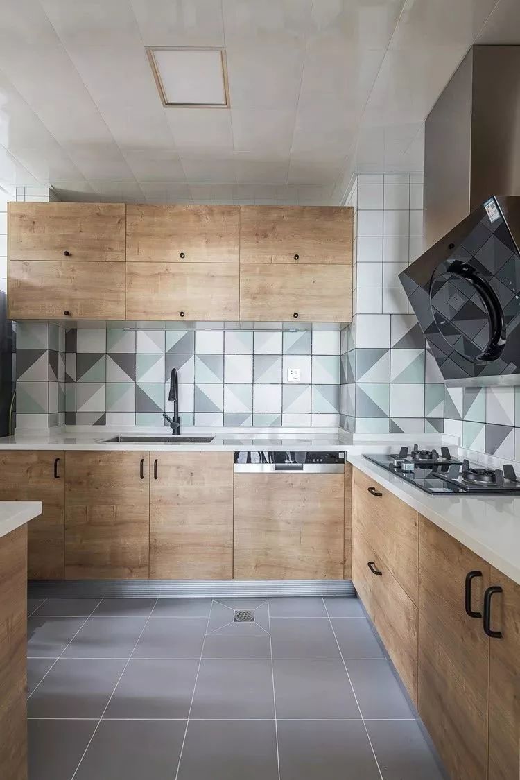 厨房和餐厅之间用玻璃推拉门作为隔断,厨房内部的橱柜做了L形的布局。在橱柜和吊柜之间加入了一些几何花砖,带来了更为独特的美感。