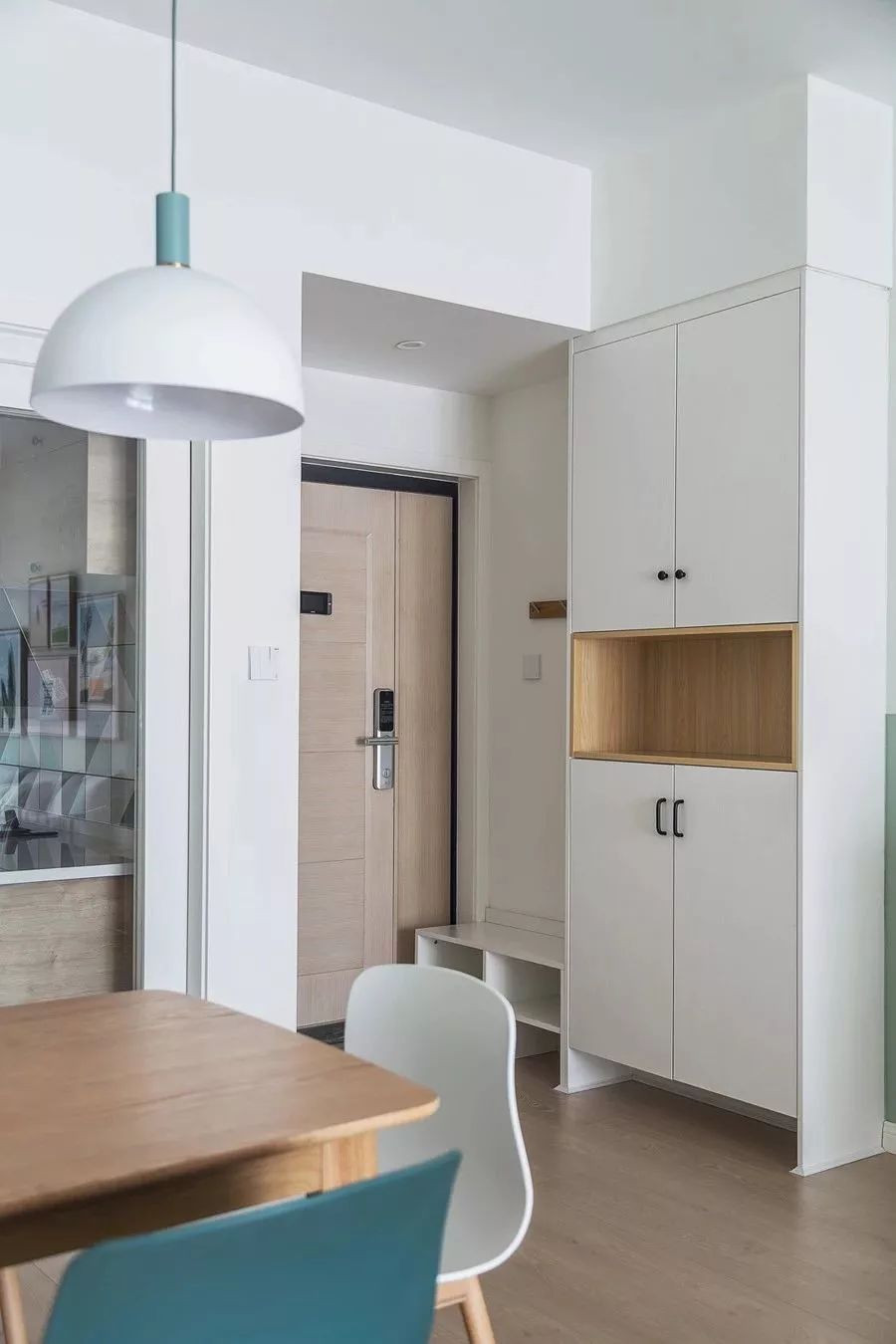 入户玄关处做了换鞋凳和鞋柜组合的设计,把两者的底部给留空,这样日常更换的鞋子就可以摆放在这里,白色与木色结合的设计显得简约而又自然。