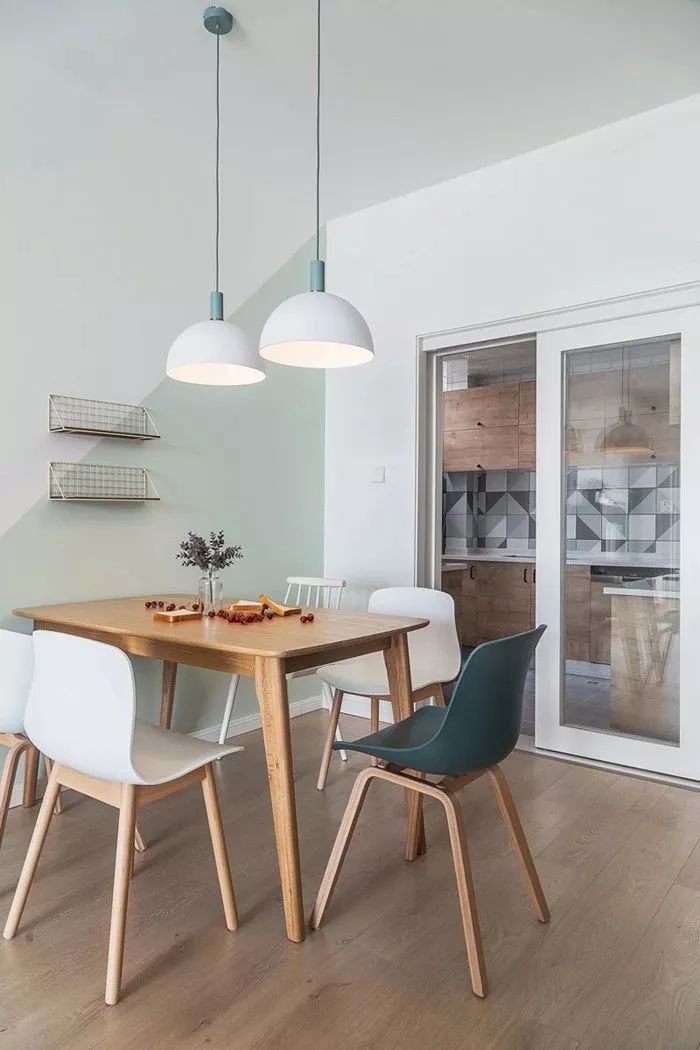 走过玄关就到了餐厅空间,餐厅的背景墙刷了一半的淡绿色,给人一种小清新的感觉。餐桌椅的款式是北欧风中常见的简洁款,可以更好的融入餐厅当中。