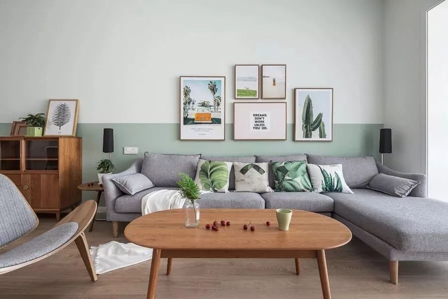 沙发背景墙是做了拼色墙的设计,淡绿色和白色的结合也让人感觉很舒适。再加上北欧风的布艺沙发、挂画和茶几等,显得轻松而又惬意。