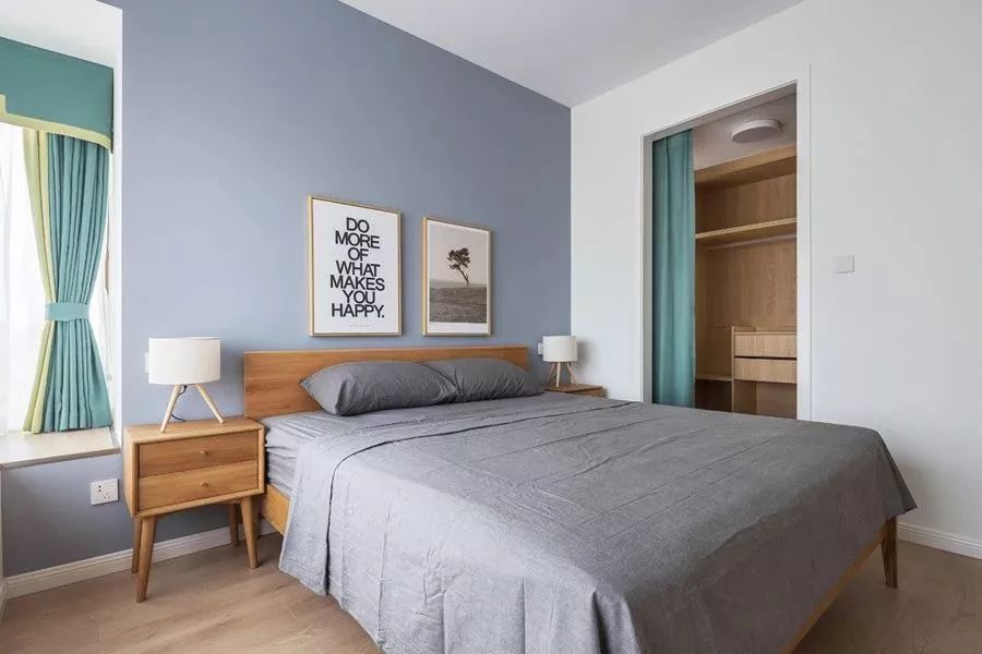 主卧室的床头背景墙是刷成了灰蓝色,和床品颜色相近又有些差别,这样的搭配让层次更加分明。卧室的衣柜被改成了一个步入式的衣帽间,绿色的帘子和窗帘相互呼应。