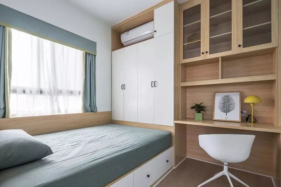 儿童房被设计成了榻榻米床组合衣柜和书桌柜的设计,对于面积比较小的空间来说,这样的设计方案拥有更多的储物空间,让儿童房的可利用面积得以提升。