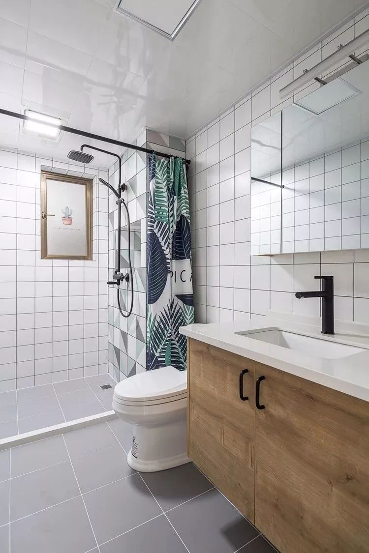 卫生间内是用浴帘和挡水条来做了干湿分离的设计,灰色的地砖搭配白色的墙砖,整个卫生间看起来也是比较简洁和轻松的。