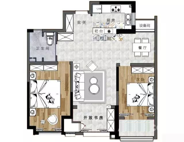 装修风格,没有过分的装饰,一切从功能出发,讲究造型比例适度、空间结构图明确美观,强调外观的明快、简洁。为了实现业主的期望,考虑到户型的问题,设计师以设计为导向,致力于打造舒适的人居环境,从而在部分区域选择使用开放式设计。开放式的设计方式不仅可以在有限的空间内满足家居功能区分,视觉上整个空间也显得宽敞,通透。一起来和青岛装修公司看看这次的