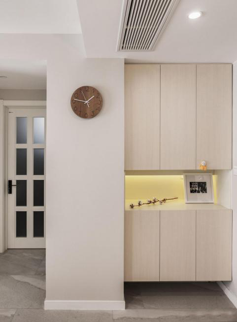 利用墙面凹处设计出鞋柜区域,柜体挂在墙上,下方留出一定距离以便日常鞋靴的脱换。鞋柜上方留出一个台面,除了可以放装饰物,还可以随身安放钥匙、零钱等小物件。