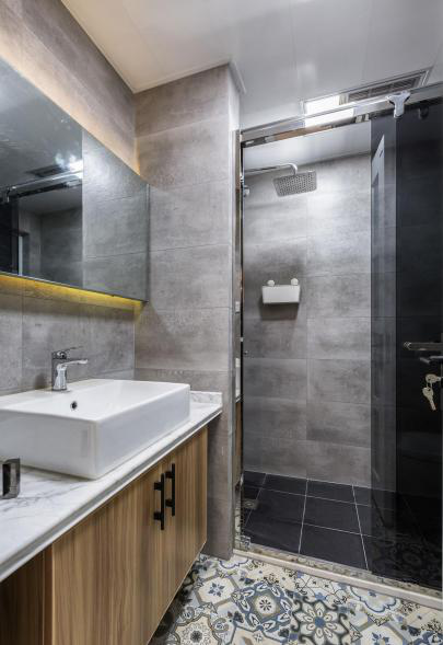 卫生间虽然面积不大,但是功能齐全。灰色瓷砖搭配花色地砖,简单中透出一抹设计感,整洁干净,美观有余。水槽选用凹槽可以有效减少水花四处溅落的情况,兼具实用性与功能性。