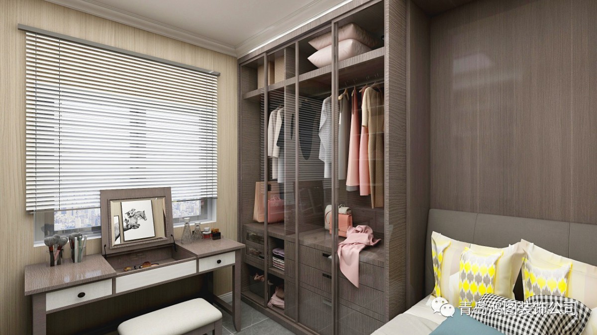 次卧空间简约沉稳,两面通顶透明的衣柜,不但增强空间通透感,也让所有衣服有了归处,多功能的化妆桌给爱美的屋主一个变美的小空间。