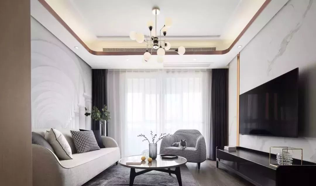 客厅空间,吊顶加了一圈金属线框,与电视背景的金属线条相呼应,彰显着空间轻奢的格调。吊灯时尚简约,造型独特,增加了空间的层次感,使整个空间看起来更加错落有致。