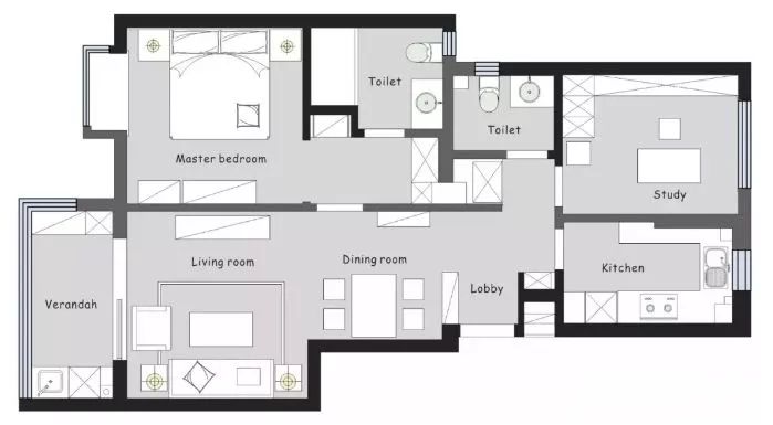 今天是一套面积为85平米的精装房改造案例,硬装无改动,仅通过软装来改变精装的千篇一律。风格上以简约为主,选购的家具与配饰以简洁的造型、完美的细节,营造出时尚前卫的感觉。色彩上以灰色为主色调,营造出优雅惬意、轻松自在的居家氛围。