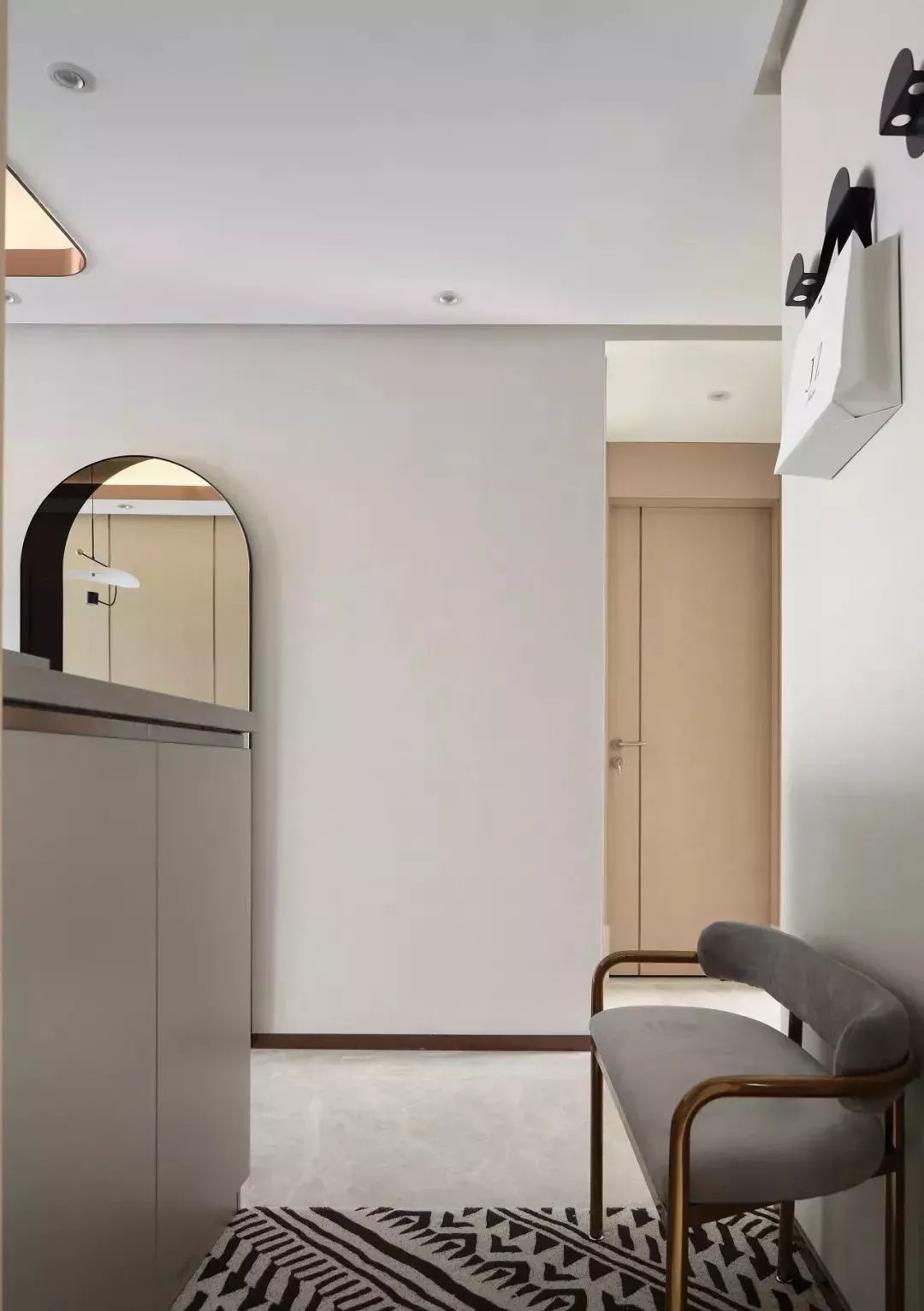 进门左手边是定制的鞋柜,灰色柜体搭配同色系石材台面,含蓄低调。地面灰色花纹地垫搭配金属腿换鞋凳,方便业主出行的同时又散发出独特的摩登气息。