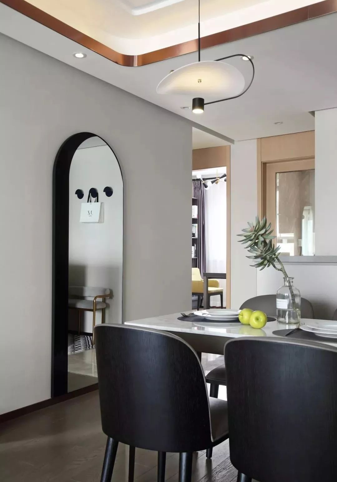 餐厅空间,实木脚搭上大理石的桌面,再配上沙发椅,柔美不做作,现代而不凌厉,打造一方简约与气质的用餐环境。