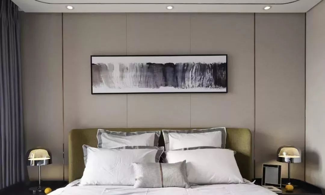 以灰色调为主的卧室,橄榄绿的床头,搭配气质的装饰画,可以缓解空间的单调乏味,宁静的气氛很助眠,在清新之余还让人感觉到暖意,十分欣喜。