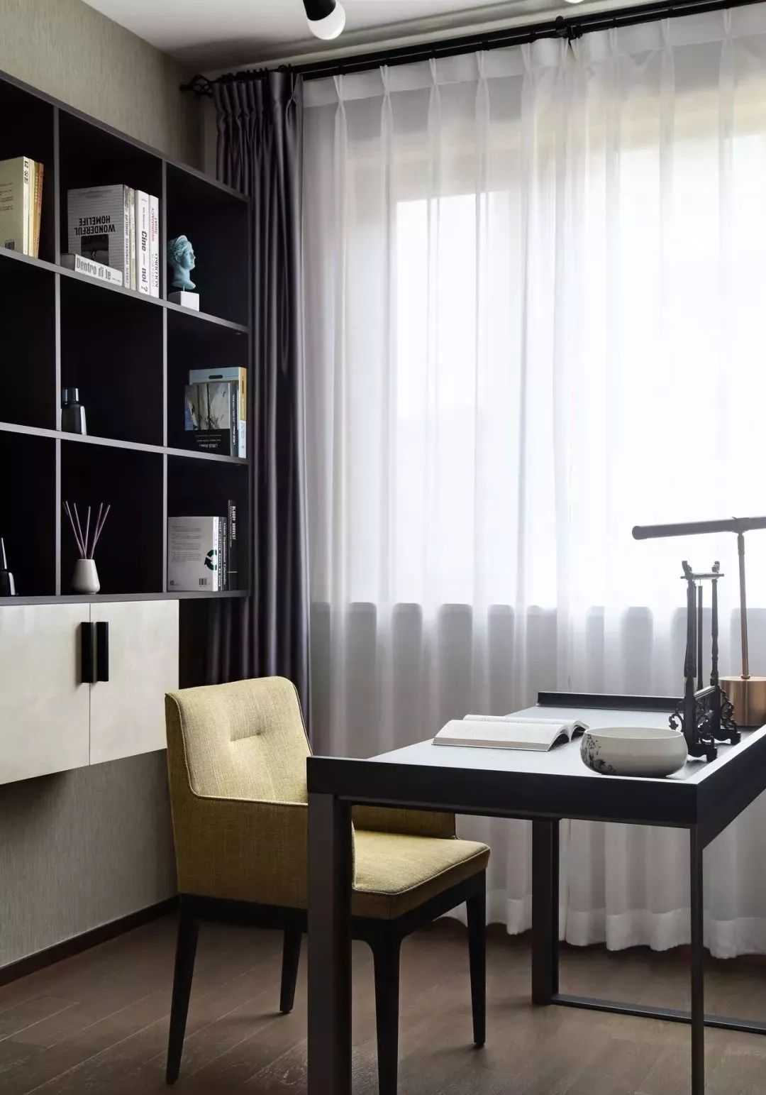 书房设计韵味十足,定制书架,搭配黑色的书桌现代却不生硬,房间内营造的氛围可以让屋主静下心来看看书、写写毛笔字,惬意、舒心。