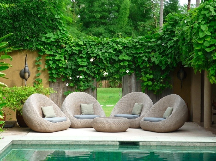 下沉式庭院,在梅雨季节很容易出现潮湿的感觉,所以地面尽量选择天然的雨花石、户外砖或防腐木,千万不要使用软木框架的家具,软木会吸潮,容易导致框架受损,尽量选择塑料、钢铁、石材框架作为代替。