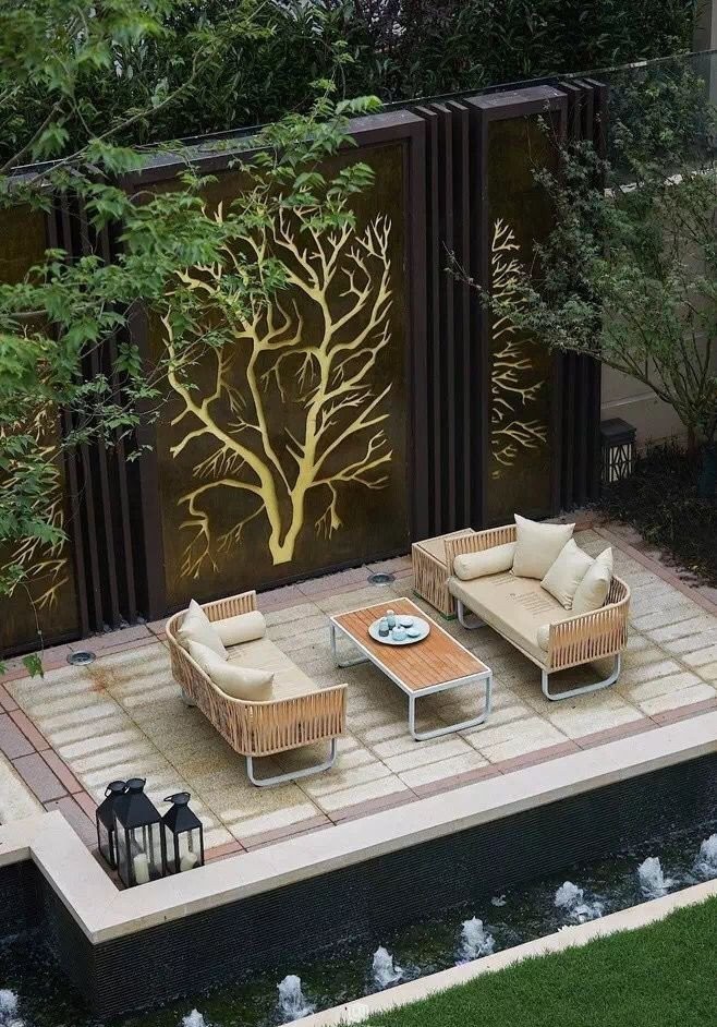 做水景时,一定要把握好大小比例,太多的水面容易湿气重,从而滋生蚊虫。建议水景与墙面结合做成流水景观,俗话说“活水不养蚊”。添加水泵,做成可流动的水景,不仅能为庭院增添流动的美感,而且还能避免蚊虫滋生。