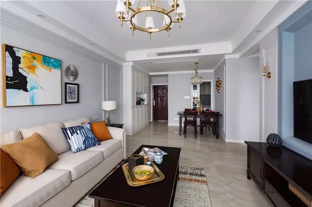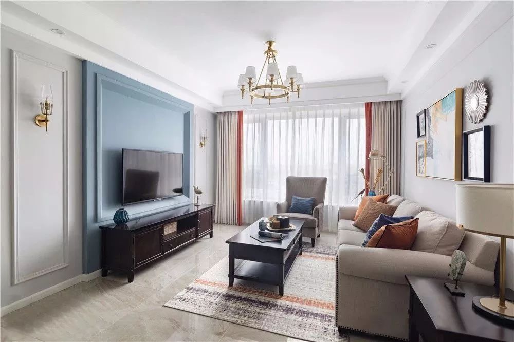 沙发背景墙与沙发采用了统一的色系,素静、淡雅。茶几、电视柜是典型的美式家具的款式和颜色,深色提升了整个空间的质感。