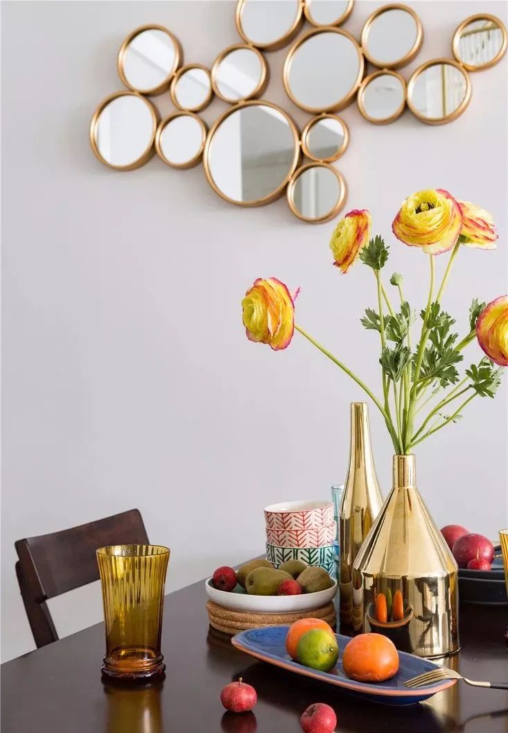 餐厅背景墙采用镜面的设计处理,提升空间质感的同时,也带来了很好的视觉效果,与精致的餐具摆饰相得益彰。