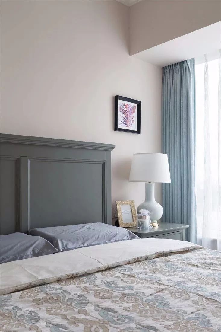 次卧选用灰蓝色作为主色调,整体空间宁静而清新。