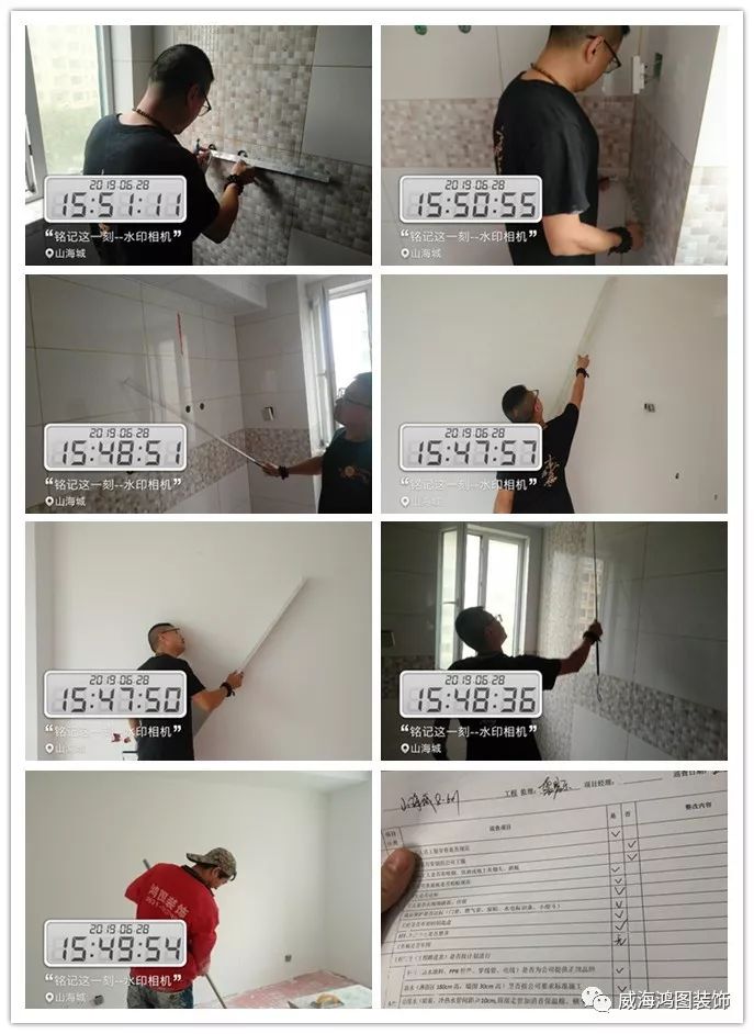 2.瓦工施工结束现场检测空鼓,检查空鼓率是否控制在标准范围之内,瓷砖缝隙是否达标,检测墙体直角度(用内外直角检测尺检测墙体阴阳角的偏差,一般在3mm以内,视为合格),以及整个空间的瓷砖是否达到横平竖直的美观度。