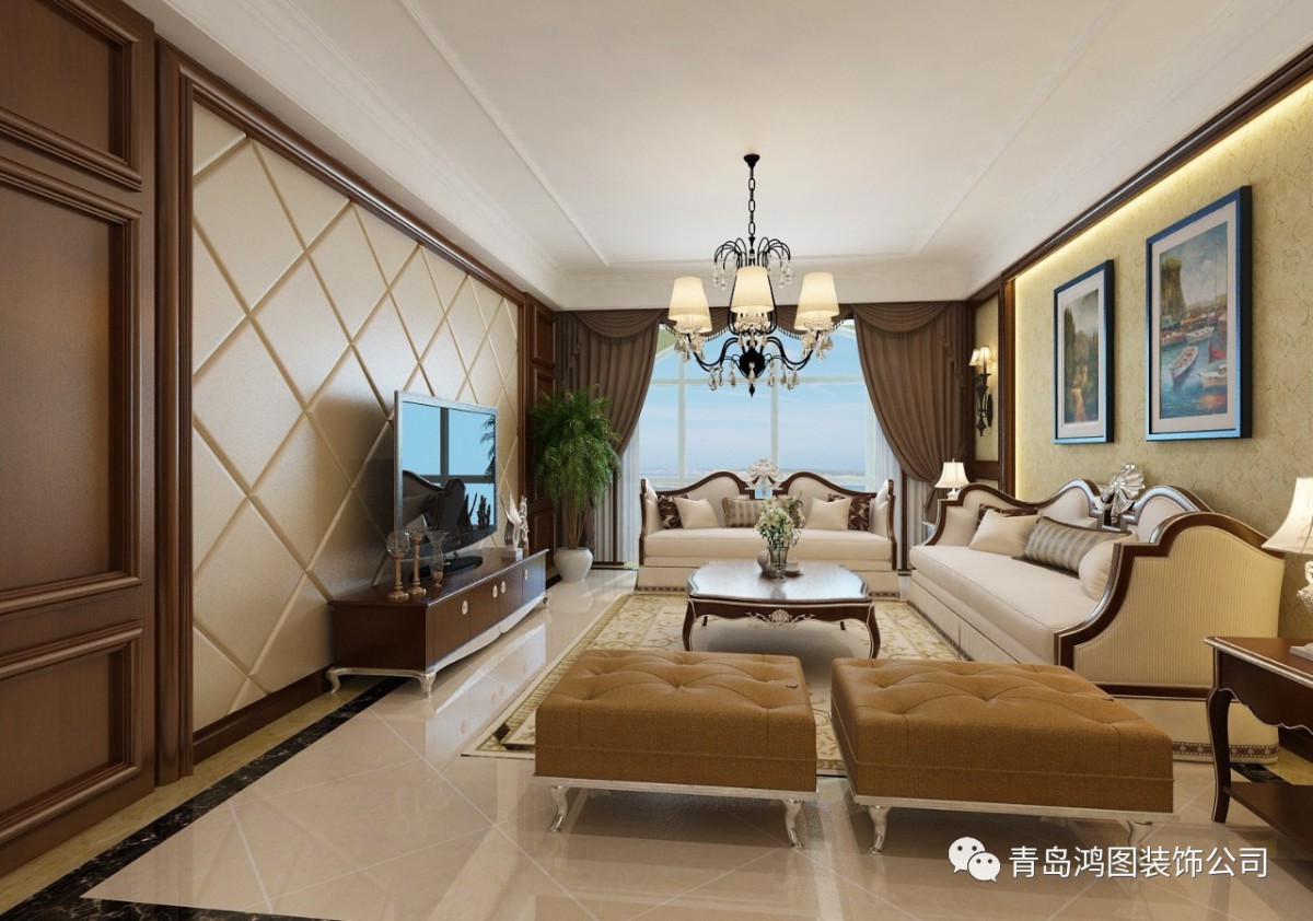 端庄大气的客厅空间,欧式皮质沙发,搭配两个极具质感的沙发凳,再加两副装饰画点缀,尽显空尽优雅气质,电视背景墙也是精致十足,搭配欧式吊灯,诠释出空间的独特魅力。