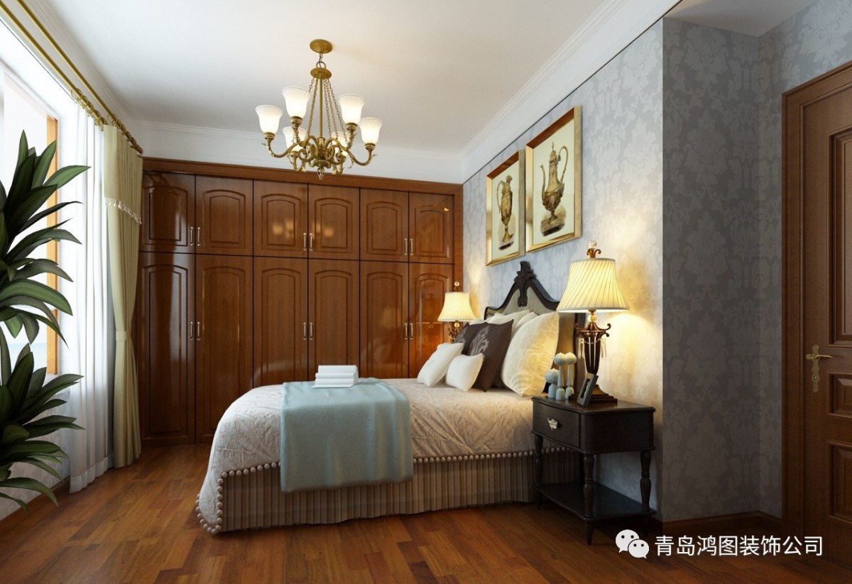 卧室空间充斥着满满的欧式格调,灰色古典壁纸让整个卧室看起来不那么繁杂却多了一份温馨,通顶衣柜,搭配欧式双人床和时尚装饰画,营造出贵气舒适的休息氛围。